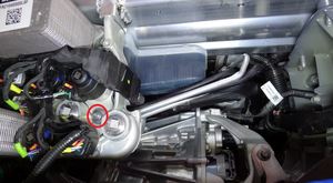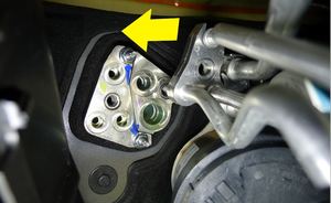 Release the HV heat pump bracket from the compressor eyelet