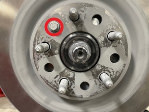 Notex5 nutsNoteThis simulates the wheel being installed, thus preventing inaccurate measurements. - Lower the vehicle to a suitable height, and then remove the brake pedal depressor.