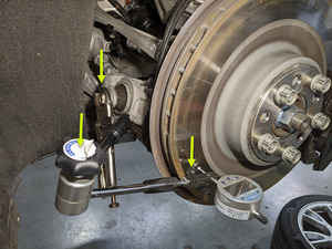 - Install the brake rotor run out flex bar onto the rear toe link bolt and setup for reading.