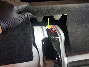 NoteLift the front of the rear trunk floor to access the top bolt and datum. - Install the 2nd row center pivot cover.