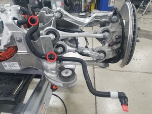 - Install the rear drive unit inverter inlet hose to the rear subframe assembly, and then fasten the clips (x2) that attach the hose to the subframe assembly.