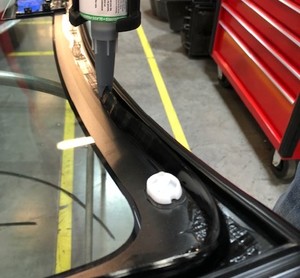 Apply urethane primer to the windshield and vehicle body along the urethane path and in areas that were damaged during removal of the windshield assembly.