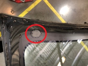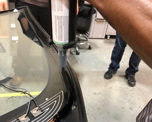 tool through urethane at lower RH side of windshield