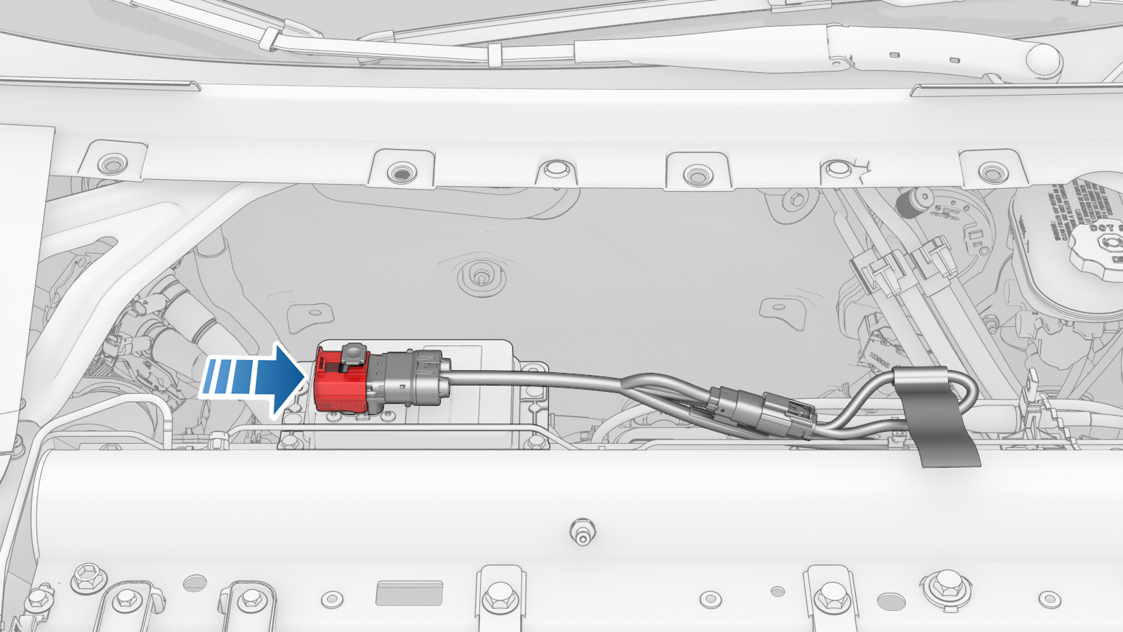 push down the connector locking tab to secure the connector to the LV battery.