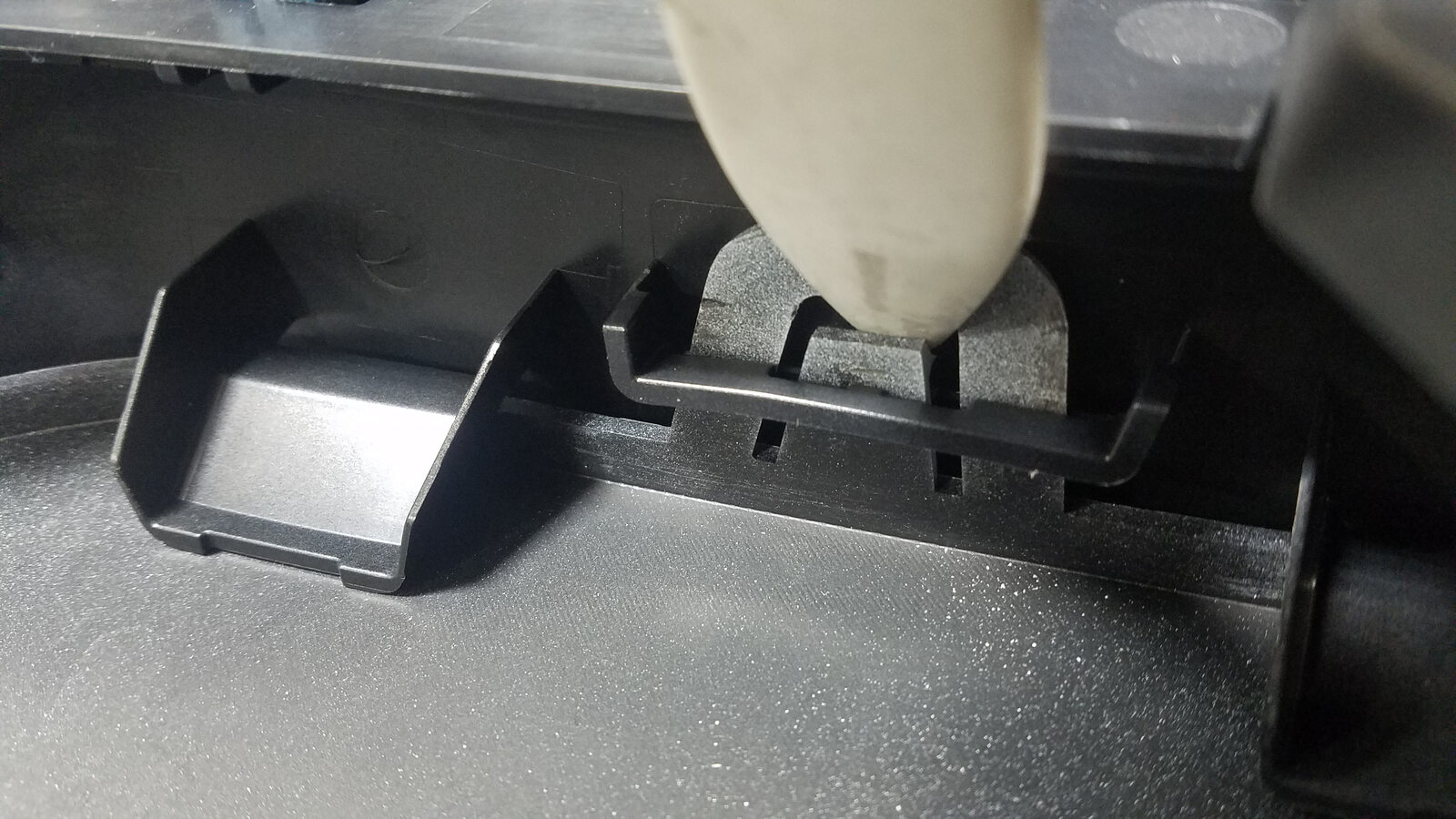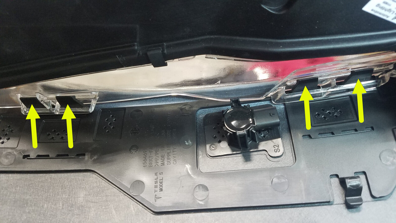 - Fasten the tabs (x4) that attach the T badge support to the front fascia assembly.