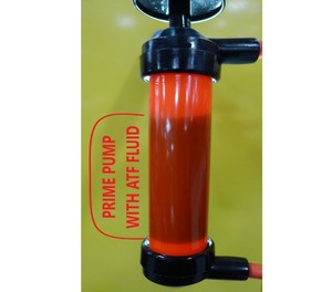 NotePlace measured fluid container in drain basket, fully submerge input hose, prime pump with KAF1 gearbox fluid.