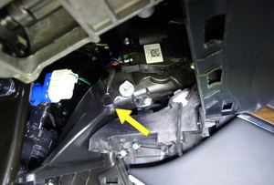 CAUTIONThe driver knee airbag is still connected to the vehicle. Be careful not to damage the electrical connectors when lowering the airbag from the instrument panel.