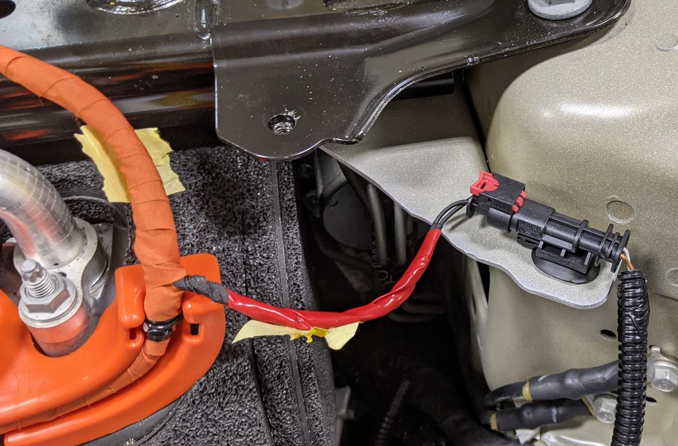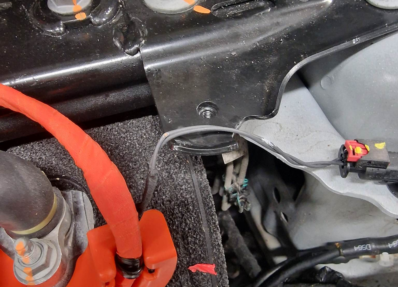 - Make sure that the HVIL harness branch of the A/C compressor HV harness is properly routed away from and does not rest upon the shock tower brace.