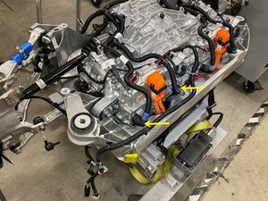 - Partially raise the rear drive unit so that the inverters just clear the rear beam of the rear subframe.