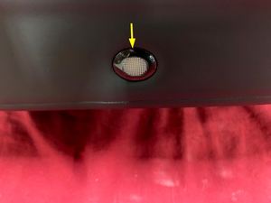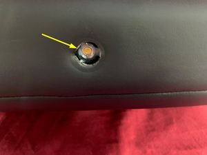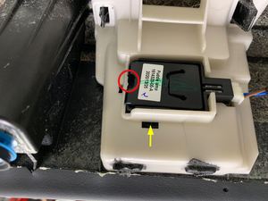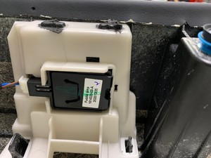 - Use a 90 degree pick to depress the locking tabs (x3), and then use a pocket screwdriver to pry the LH front door puddle light through the access hole in the LH front door trim panel.