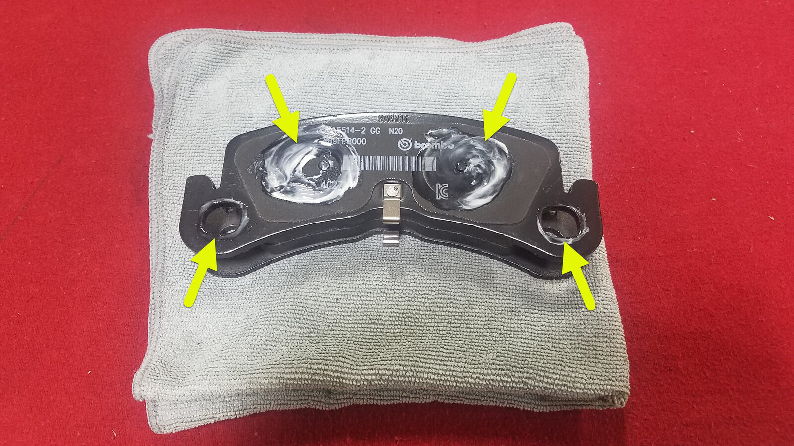 brake caliper lubricant to both brake pad's guide pin (x2) and piston (x2) contact