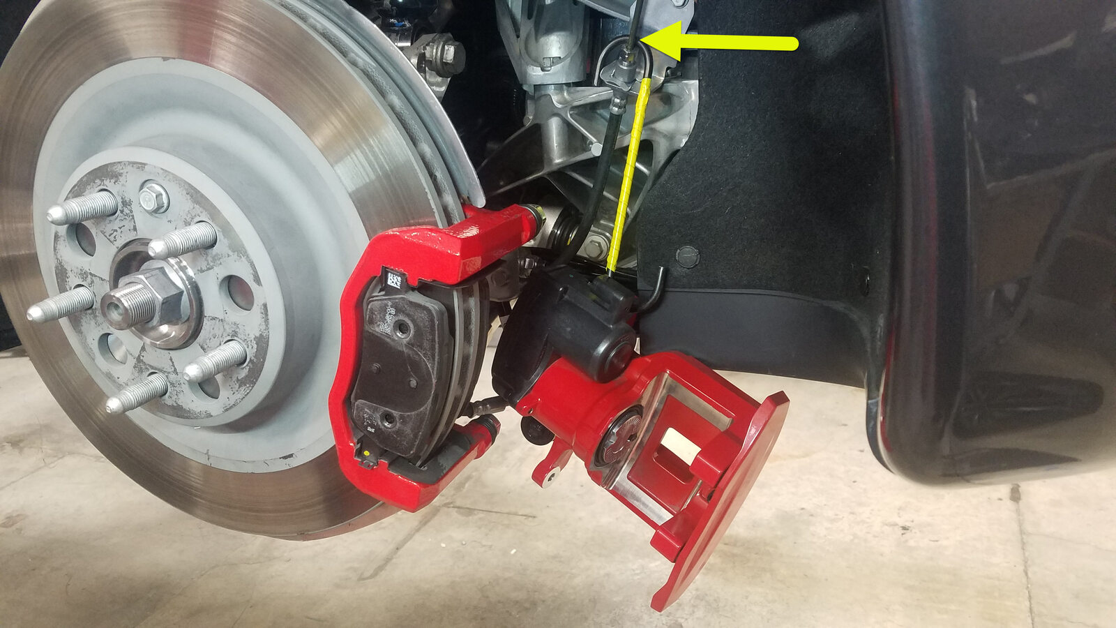 - Pull the red tab, and then pull the red tab a second time to disconnect the LH EPB harness from the LH rear caliper connector.