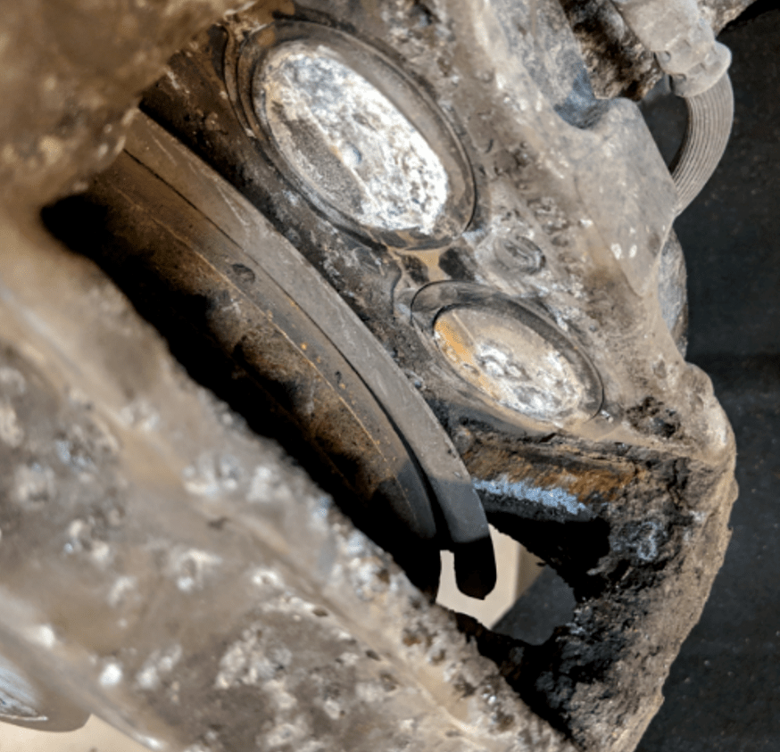 - First use a brake pad puller to remove any stuck brake pads before escalating to an air hammer with blunt chisel tip to break the pads free from the caliper.