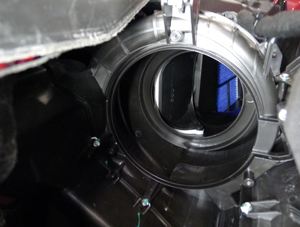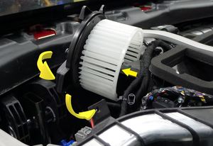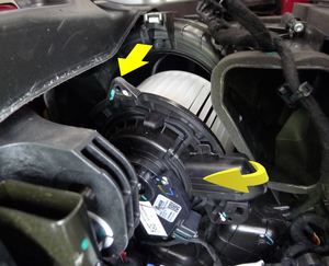 3 Nm (2.2 lbs-ft)Tip: Use the T20 bit, mini ratchet and extension from the 1/2 Cut Bit Set. - Connect the HVAC blower motor electrical connector, and then fasten the clips (x2) that attach the blower motor wiring harness to the HVAC assembly.