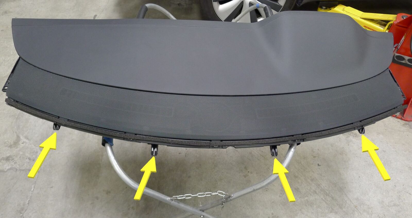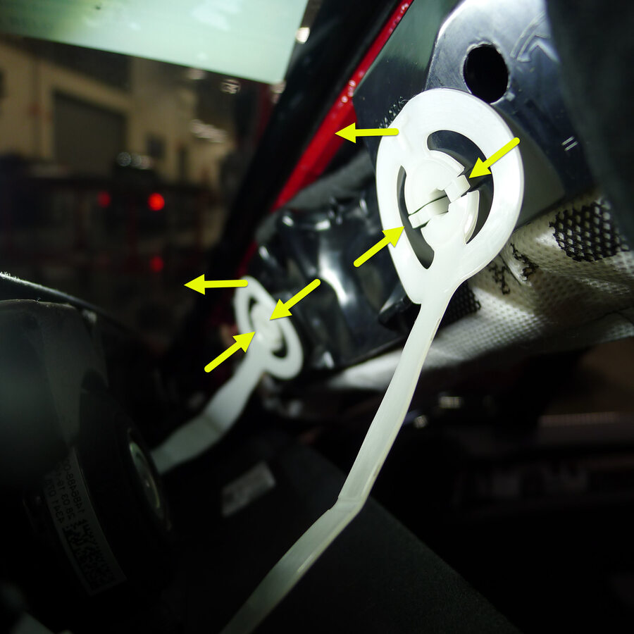 Note2x tethered clips, 1x clip, 1x connector, Slide bottom of trim along IP and speaker grill, attach each tether to body side, Set clips starting at the bottom and work up, Pull seal over trim