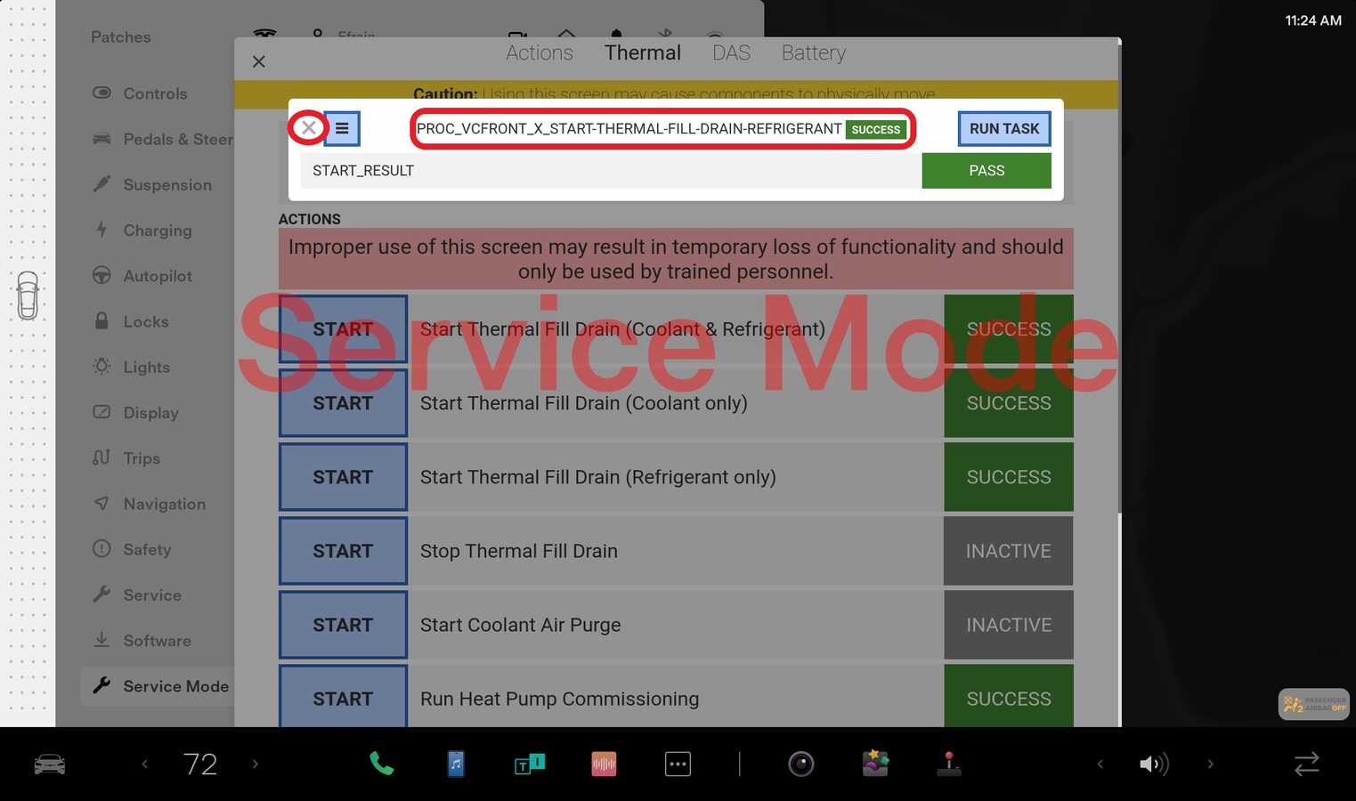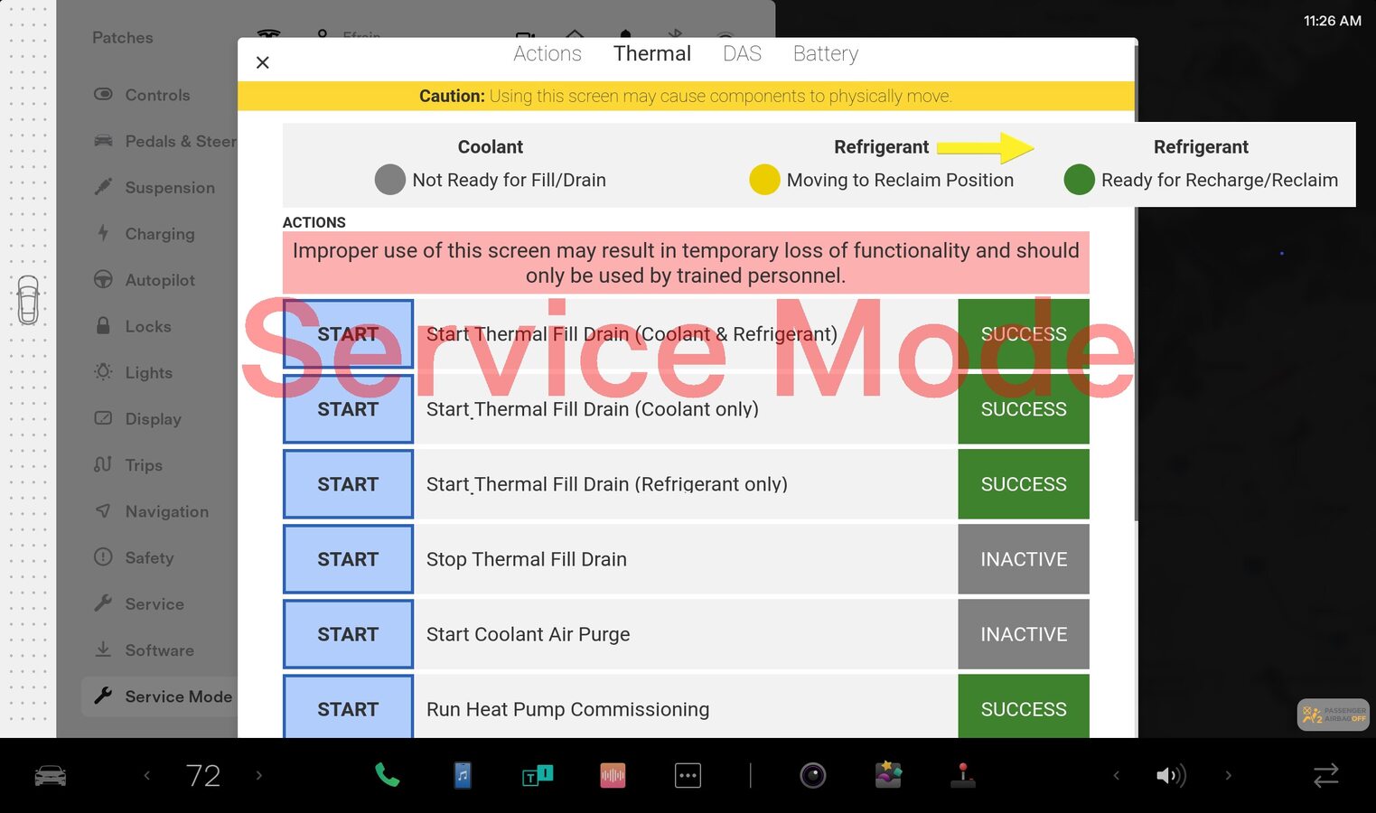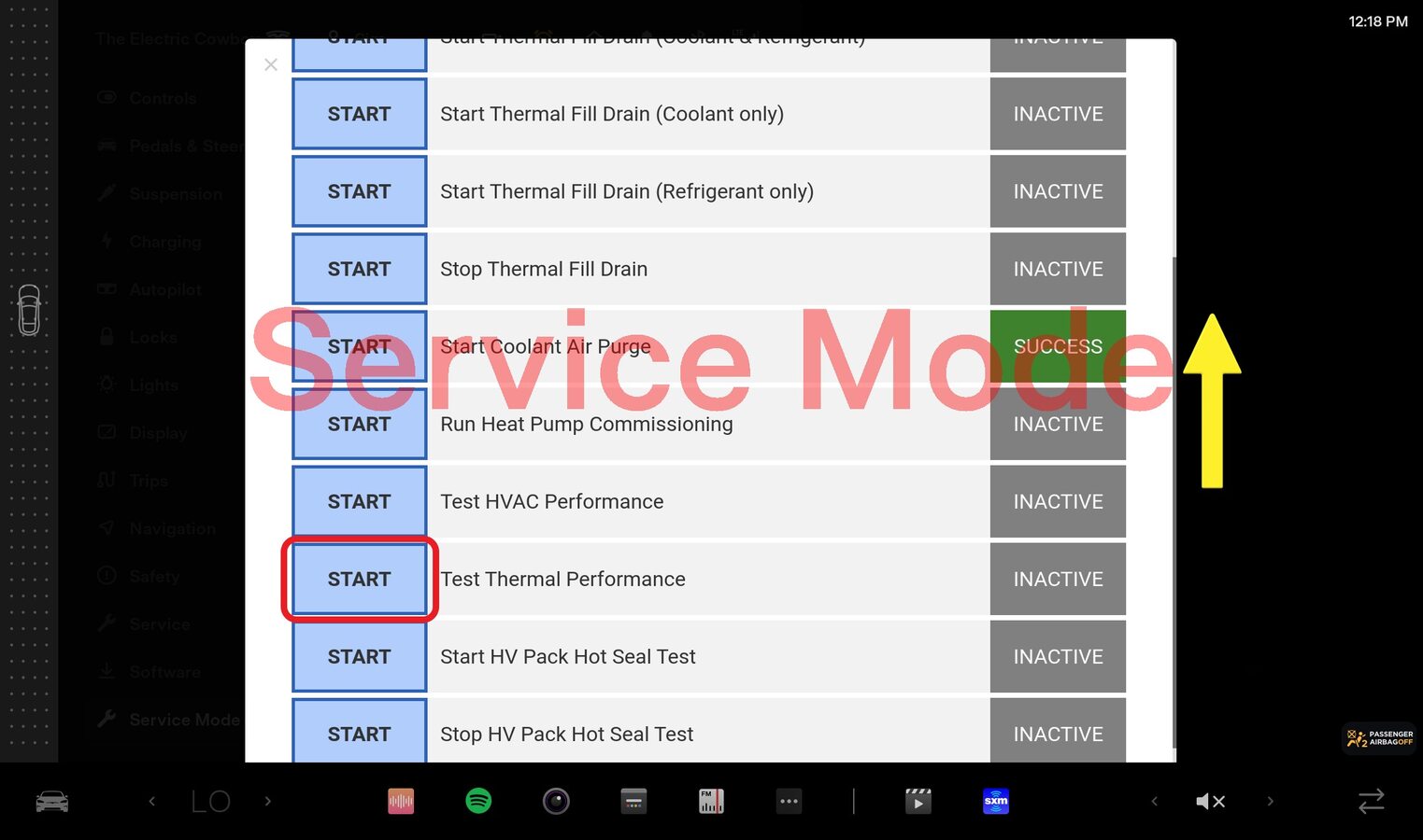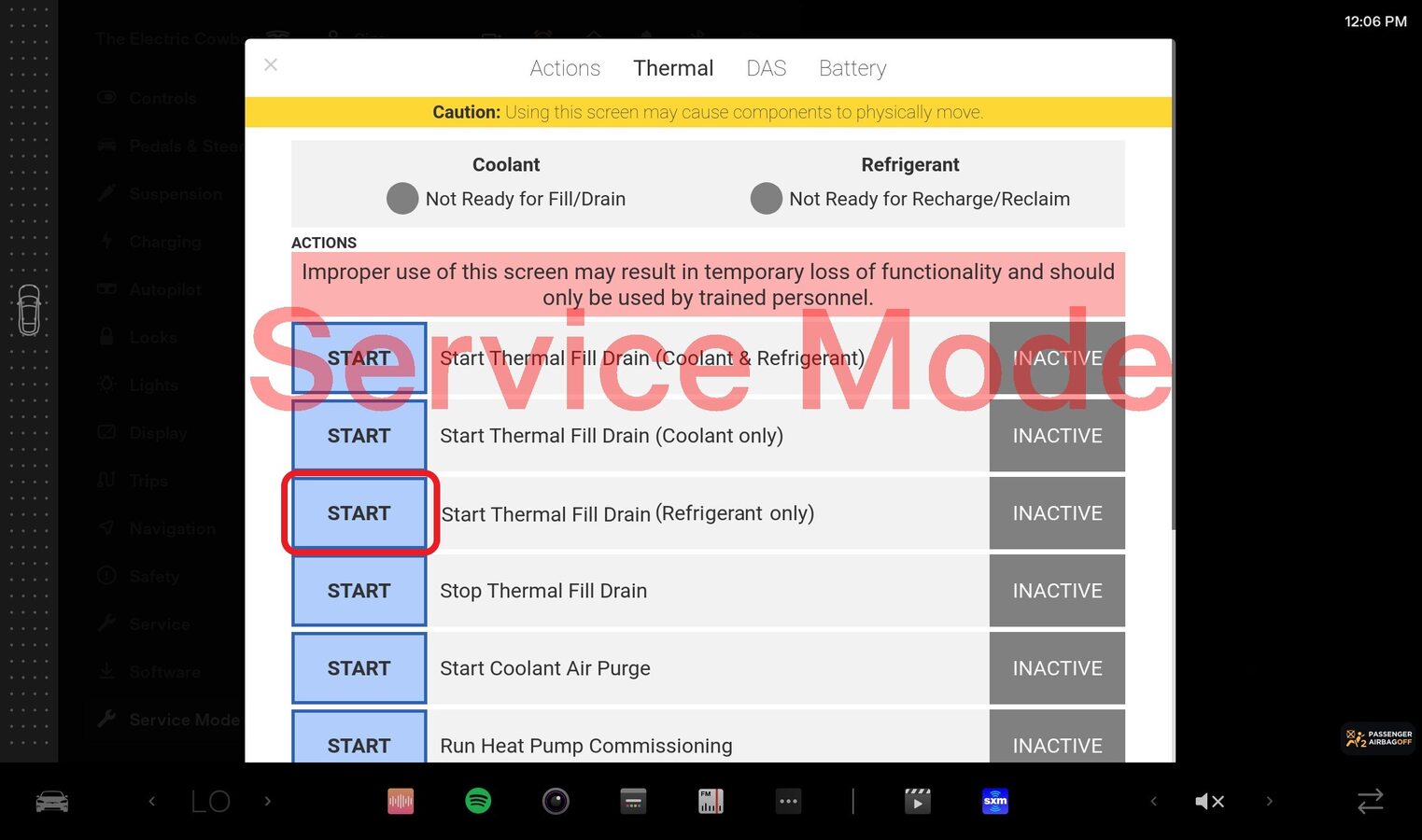 NoteSelect quick controls > Service mode > Diagnostics > Thermal, Authorize routines by holding right turn signal, depressing brake pedal for 10 seconds with key on phone dock