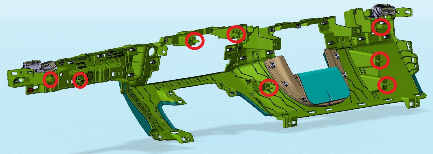 Note21x clips, 6x datums, 4x connectors, Connect ambient bright harness, Secure each IP decor connector clip to IP carrier, Secure IP decor to lower instrument panel