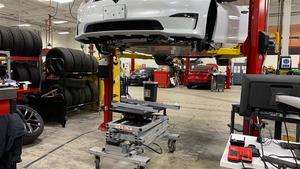 - Lower the subframe lift, disconnect the shop supply air, and move the lift out from under the vehicle.