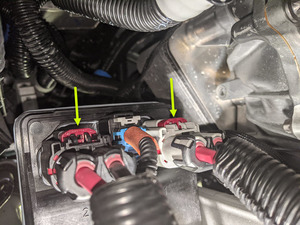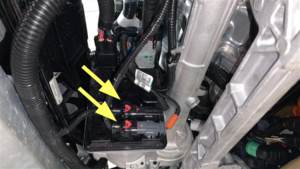 - Connect the electrical harness to the EPAS CAN connectors (x2), and then slide the red locking tabs.