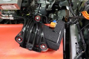Position AC compressor bracket assembly into vehicle and secure AC compressor assembly to multi-system beam