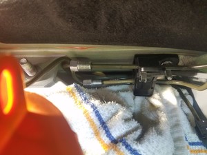 - Place shop rags underneath the front end of the RH brake junction to jounce pipe to catch any fluid lost.
