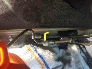 - Install the clip that attaches the battery supply hose to the RH side of the frunk harness.