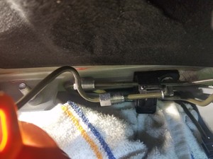 - Remove the shop rags from underneath the front end of the RH brake junction to jounce pipe.
