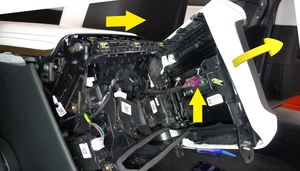 - Release the clips (x4) that attach the rear portion of the LH center console side panel to the center console assembly, and then wedge a shop towel between the panel and center console assembly to hold the panel away from the assembly. Repeat this step for the RH center console side panel.