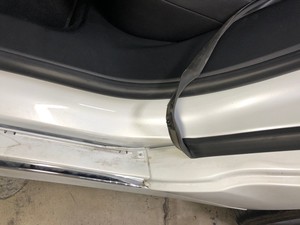 - Press the body side secondary seal down onto the rear of the LH rocker panel scuff plate to attach the adhesive strip, and then press the length of the seal onto the scuff plate in a forward motion.