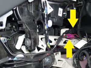- Connect the electrical connectors (x2), and then fasten the clips (x3) that attach the electrical harness to the RH toeboard bracket and IP lower support.