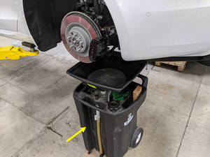 - Remove the banjo bolt that attaches the brake hose to the LH rear brake caliper. Catch any fluid lost in the oil drain.