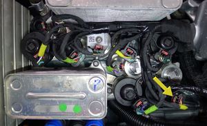 - Pull out the red tab release the connector lock, then pull on the red tab again to disconnect the electrical harness from the high pressure PT High sensor connector.