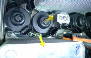 - Pull out the red tab release the connector lock, then pull on the red tab again to disconnect the electrical harness from the shut off valve liquid cooled condenser connector.