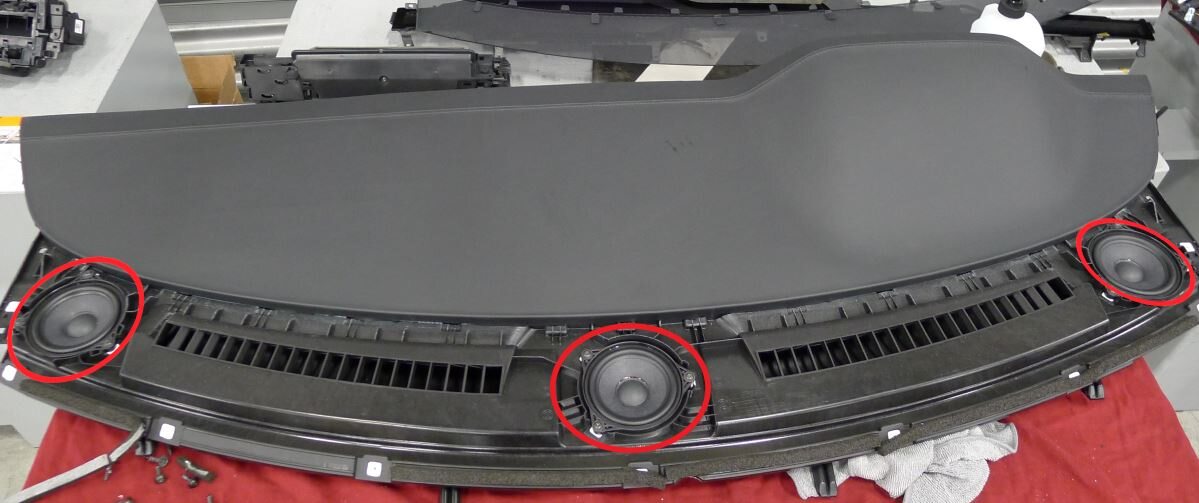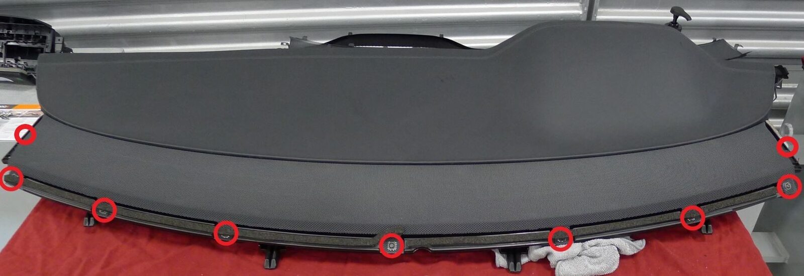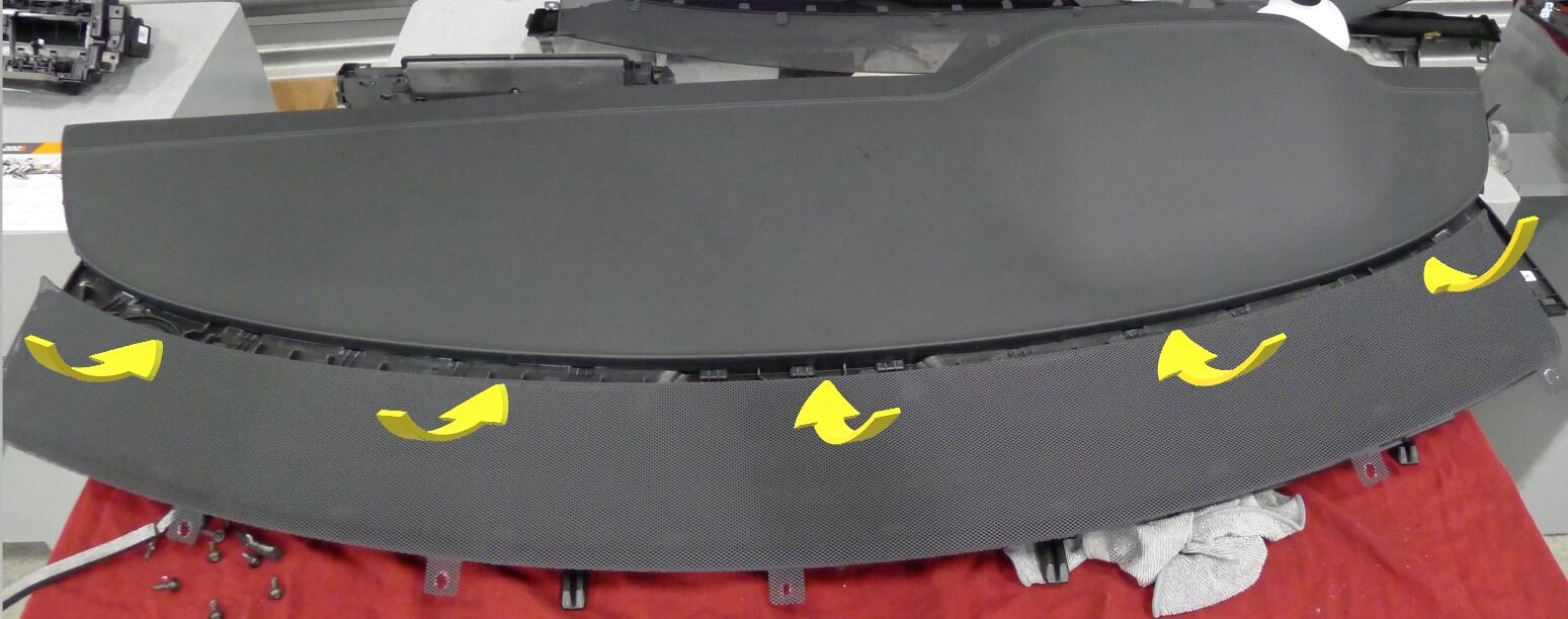 Note2x tethered clips, 1x clip, 1x connector, Slide bottom of trim along IP and speaker grill, attach each tether to body side, Set clips starting at the bottom and work up, Pull seal over trim