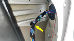 - Push the LH front door harness through the door and into the body of the vehicle, and then seat the grommets (x2) and install the retaining clip.