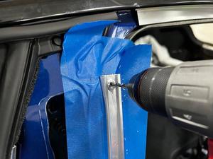Align the front portion of the LH rear body side primary seal onto the vehicle, peel off the back side cover for the double sided adhesive, adhere the seal onto the body panel, and then secure the clip that attaches the seal to the body.