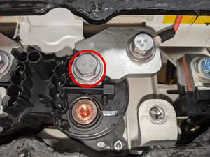 - Vehicles built September 19, 2022 and later only - Remove and discard the bolt that attaches the negative inlet fast charge busbar to the negative DC input busbar.