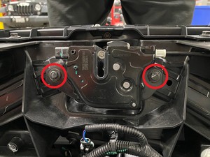 4. Remove the bolts (x2) that attach the double pull single actuator hood latch to the front end carrier assembly, and then remove the latch from the vehicle.