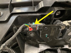 2. Disconnect the double pull single actuator hood latch wiring harness electrical connector.