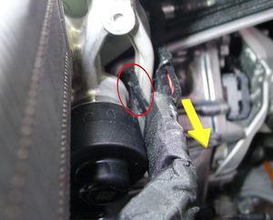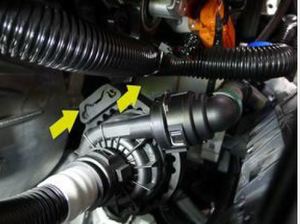Secure clips securing heat pump harness at the bottom of coolant bottle