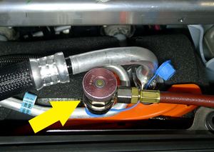 Verify Thermal Fill Drain then connect hoses to vehicle and perform A/C recovery