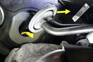 Release washer hose nozzle by LH shock tower cover