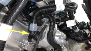 - Release the clip, disconnect the powertrain coolant return hose from the front drive unit heat exchanger, and then immediately plug the fittings for the hose and heat exchanger.