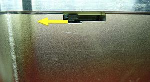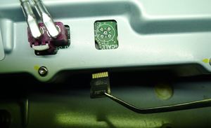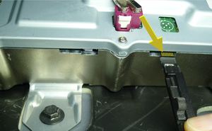 Notex1 retaining tab.NoteEject the SD card by sliding the locking tab away from the SD card. The SD card may eject quickly and fall. Once ejected and the SD card is still in car computer slot, it can be removed with tweezers.NoteDestroy the removed SD card.