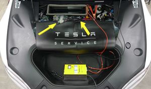 NotePlace fender cover over multi-system beam. Connect first responder loop then secure 12v maintainer to positive jump post and chassis ground. Vehicle will power on with 0% Low Voltage message at UI.