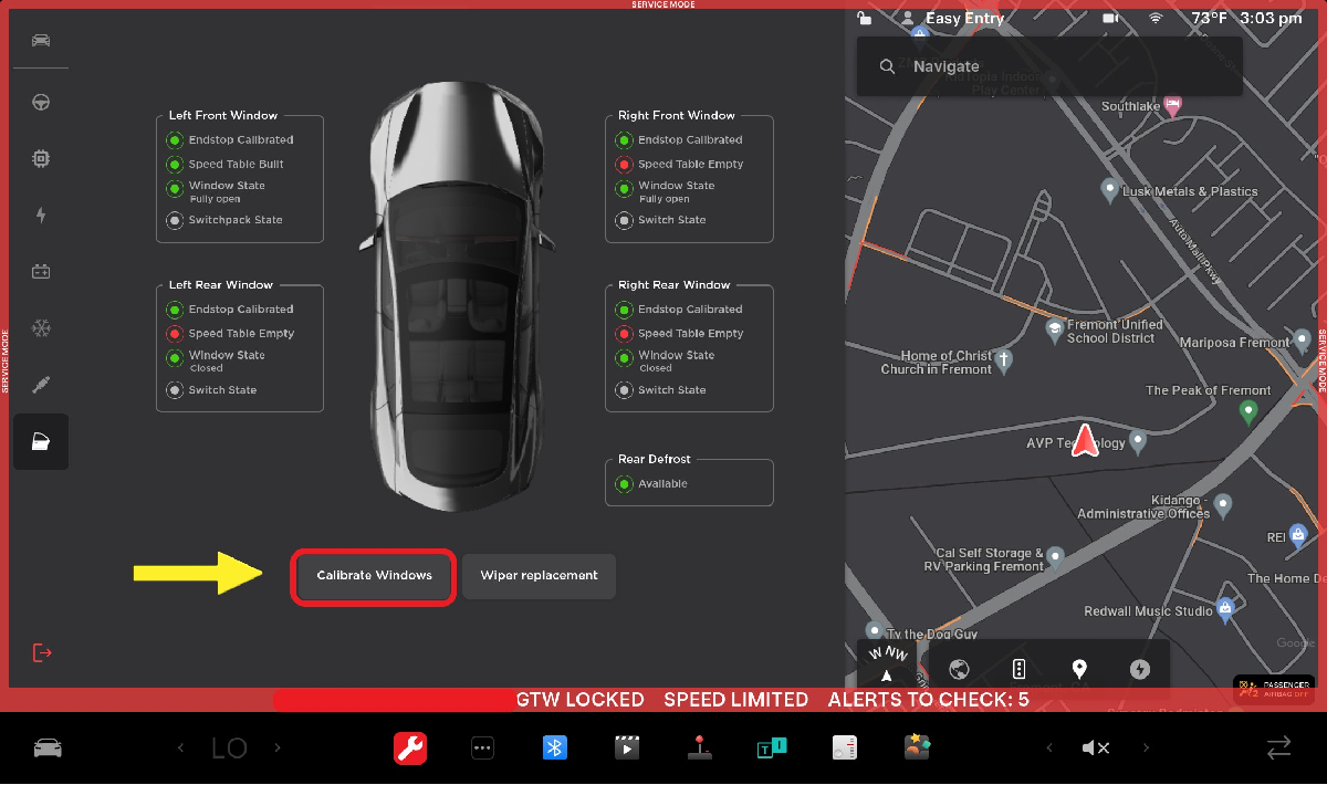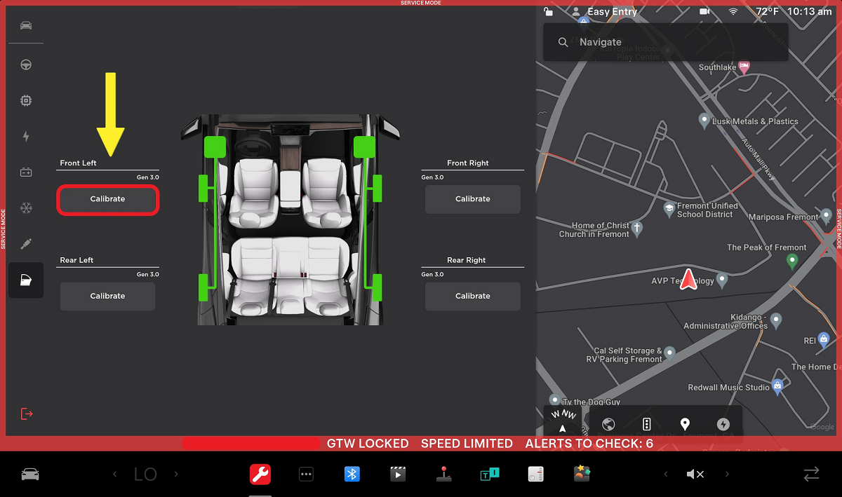 - In the door handle calibration screen, touch Calibrate for the Front Left door handle.