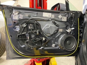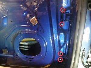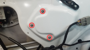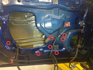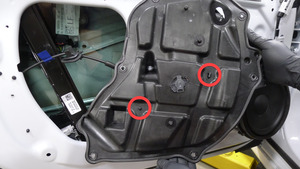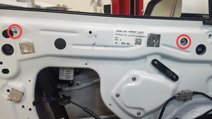- Remove the plugs (x2) that cover the openings in the door for access to the LH front regulator mounting guides.