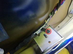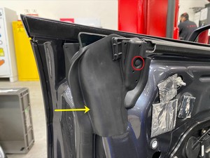 - Feed the LH front door wiring harness through the door and into the body of the vehicle seating both grommets (x2), and then attach the retaining clip.