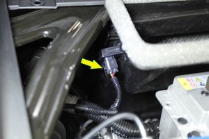 Install clip securing battery supply hose to frunk harness.