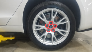 Remove lug nut covers from LH front wheel